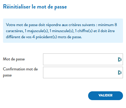 Dès la réception du mail de réinitialisation de mot de passe, cliquez sur le lien et saisissez votre mot de passe personnel en respectant les conditions minimales suivantes : 8 caractères, 1 majuscule 1 minuscule, 1 chiffre.