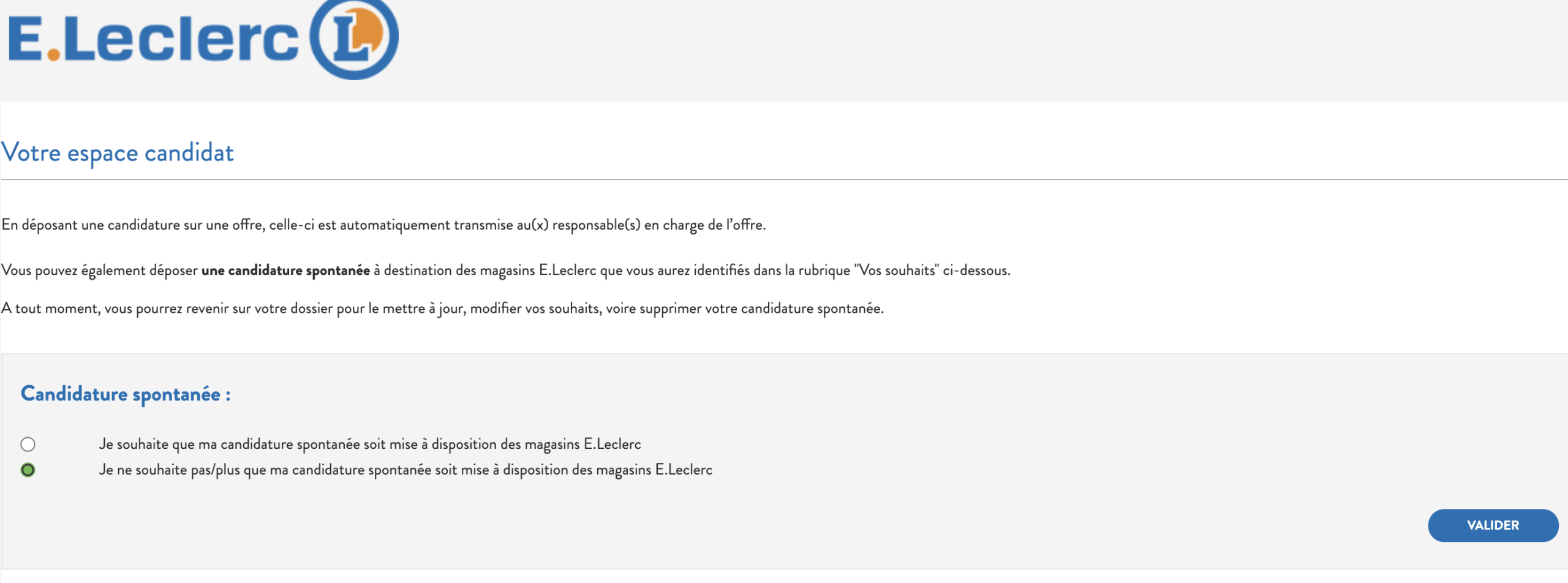 Vous pouvez accepter ou refuser que vos données candidat puissent être conservées par l’entité E.Leclerc auprès de laquelle vous avez postulé. Cela permettrait par exemple que vous puissiez être contacté directement par cette entité pour une autre offre.